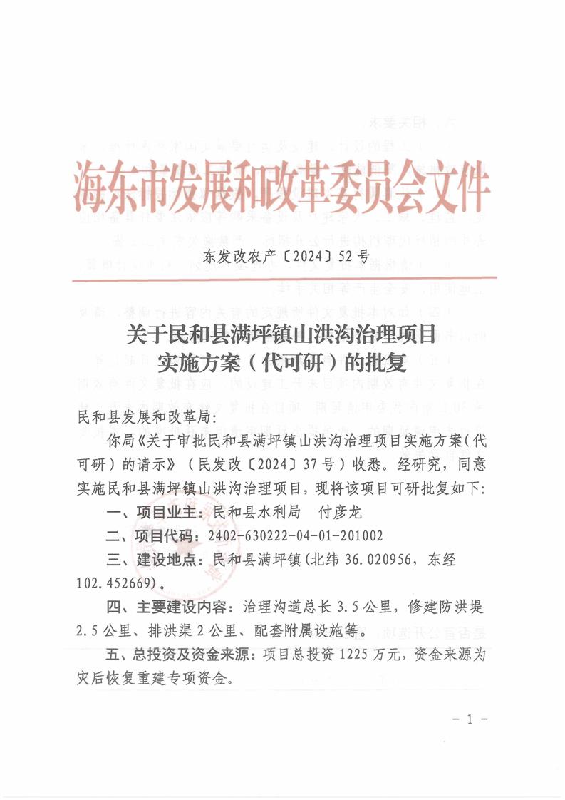 关于民和县满坪镇山洪沟治理项目实施方案(代可研)的批复