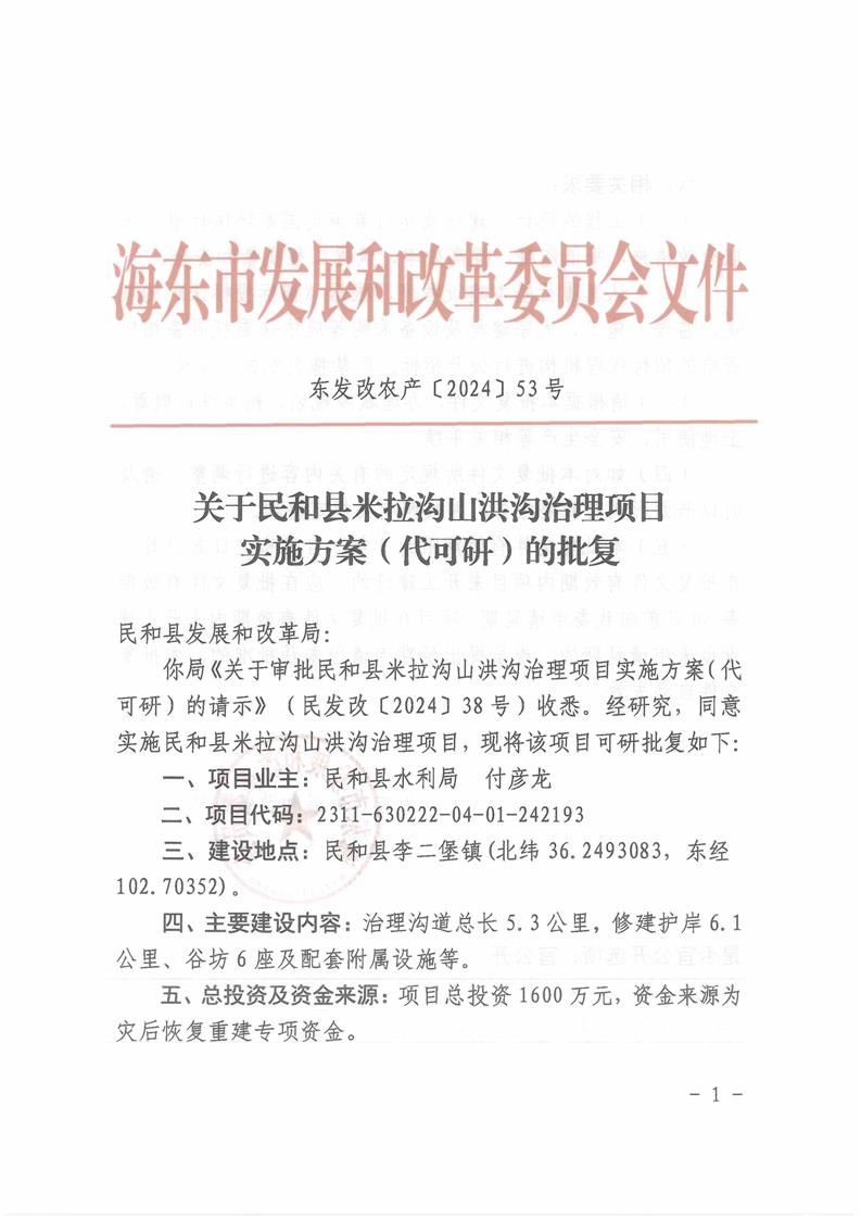 关于民和县米拉沟山洪沟治理项目实施方案(代可研)的批复