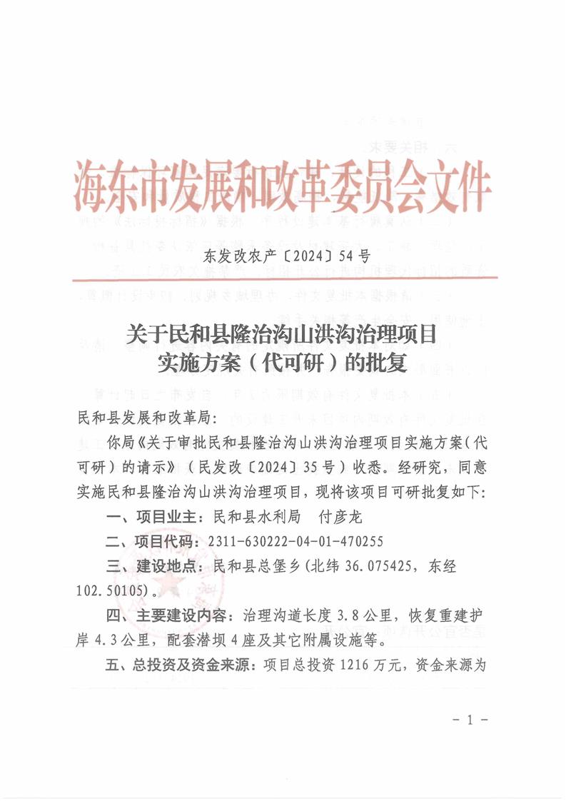 关于民和县隆治沟山洪沟治理项目实施方案(代可研)的批复