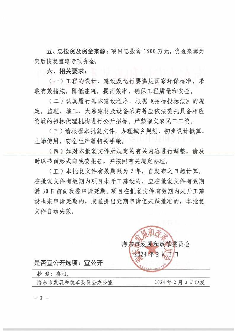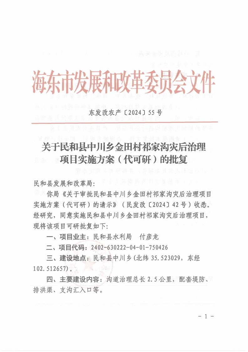 关于民和县中川乡金田村祁家沟灾后治理项目实施方案(代可研)的批复