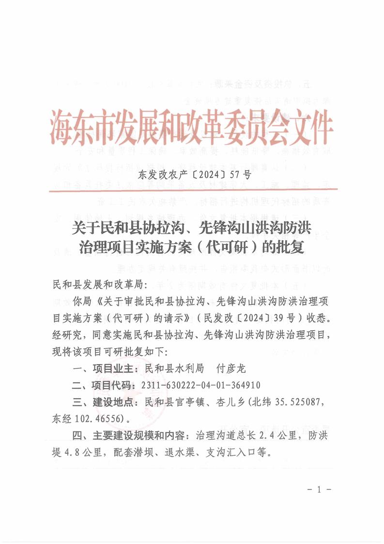 关于民和县协拉沟、先锋沟山洪沟防洪治理项目实施方案(代可研)的批复