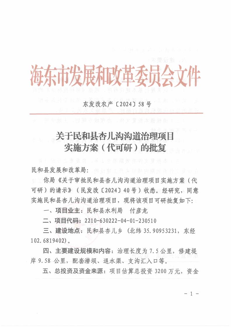 关于民和县杏儿沟沟道治理项目实施方案(代可研)的批复