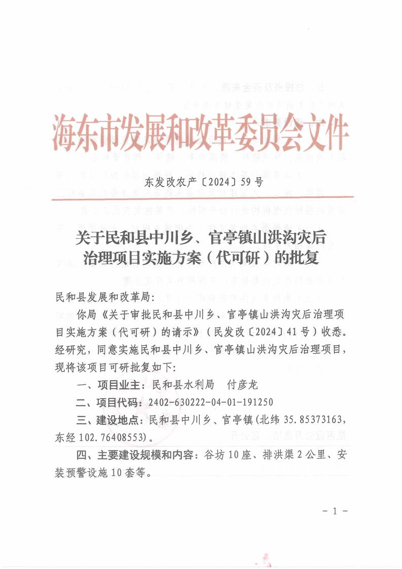 关于民和县中川乡、官亭镇山洪沟灾后治理项目实施方案(代可研)的批复