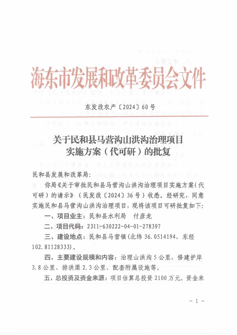 关于民和县马营沟山洪沟治理项目实施方案(代可研)的批复