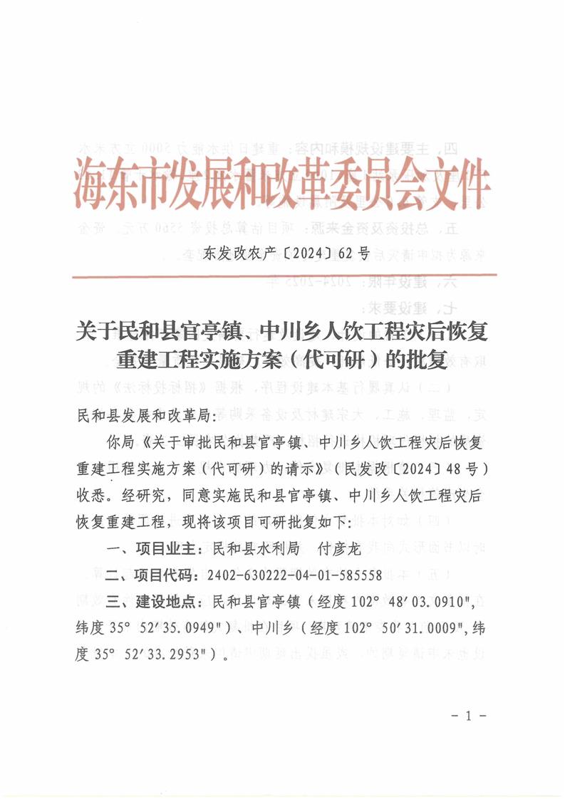 关于民和县官亭镇、中川乡人饮工程灾后恢复重建工程实施方案(代可研)的批复