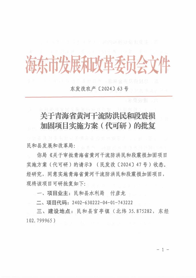 关于青海省黄河干流防洪民和段震损加固项目实施方案(代可研)的批复