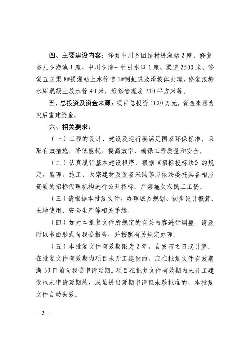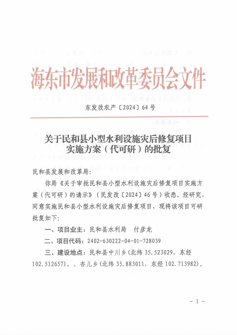 关于民和县小型水利设施灾后修复项目实施方案(代可研)的批复