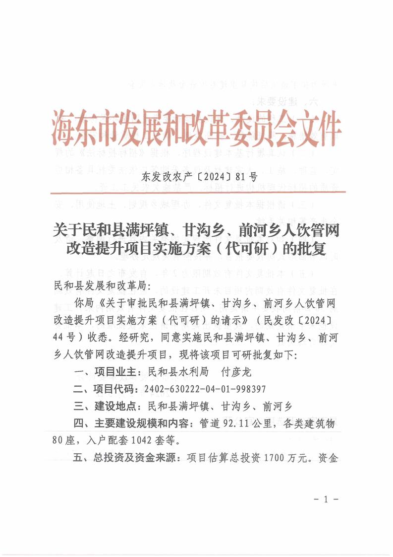 关于民和县满坪镇、甘沟乡、前河乡人饮管网改造提升项目实施方案(代可研)的批复