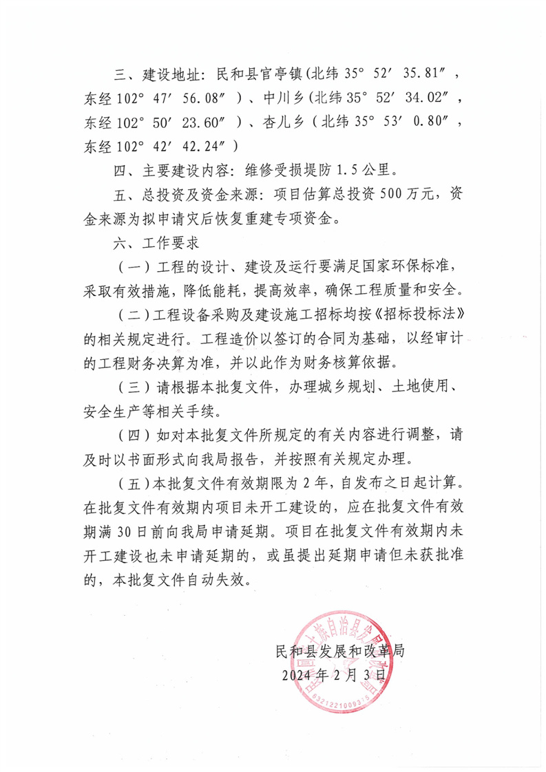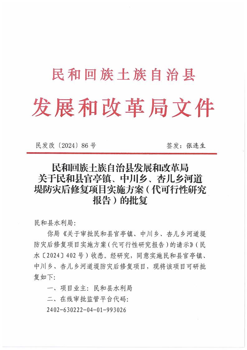 关于民和县官亭镇、中川乡、杏儿乡河道堤防灾后修复项目实施(代可行性研究报告)的批复