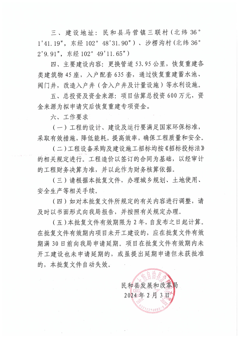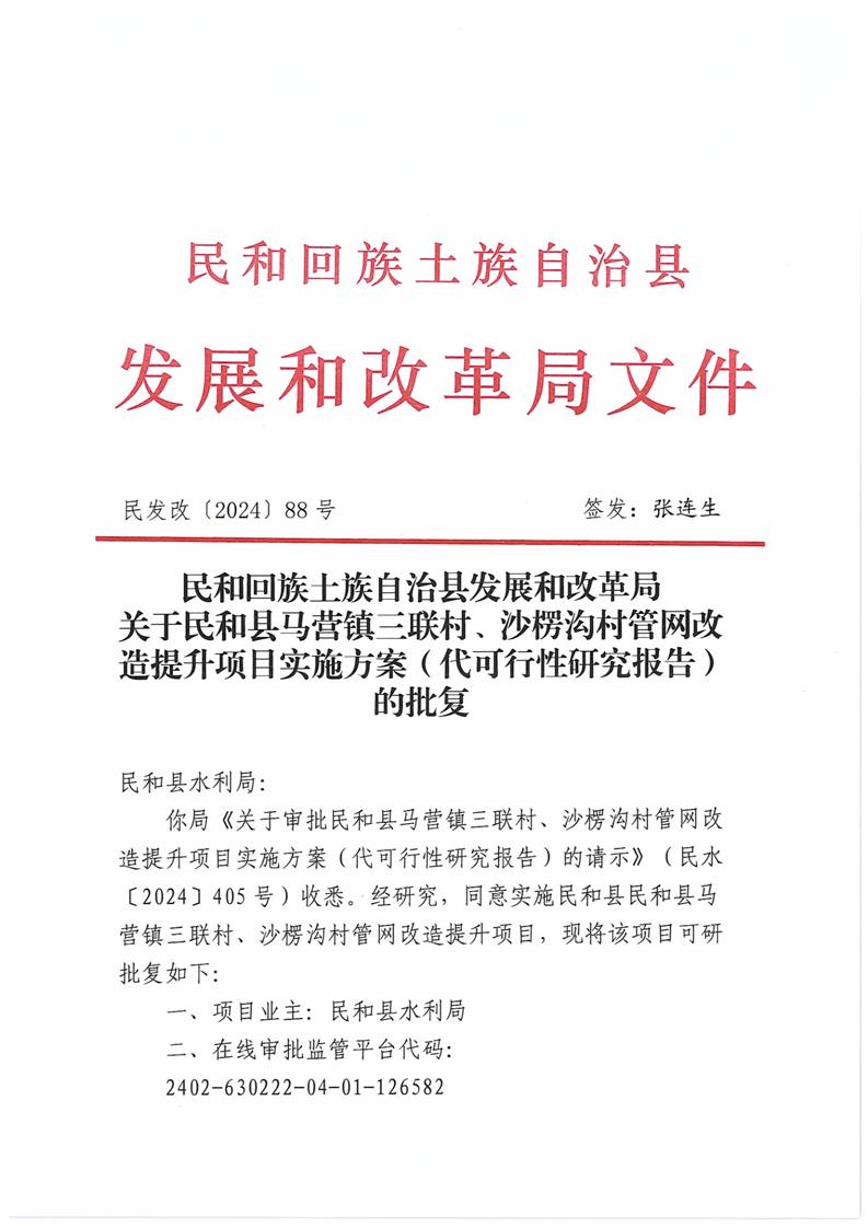 关于民和县马营镇三联村、沙楞沟村管网改造提升项目实施方案(代可行性研究报告)的批复