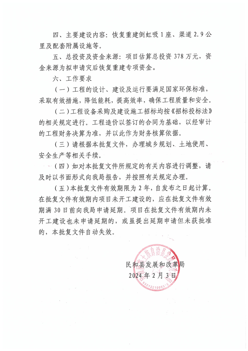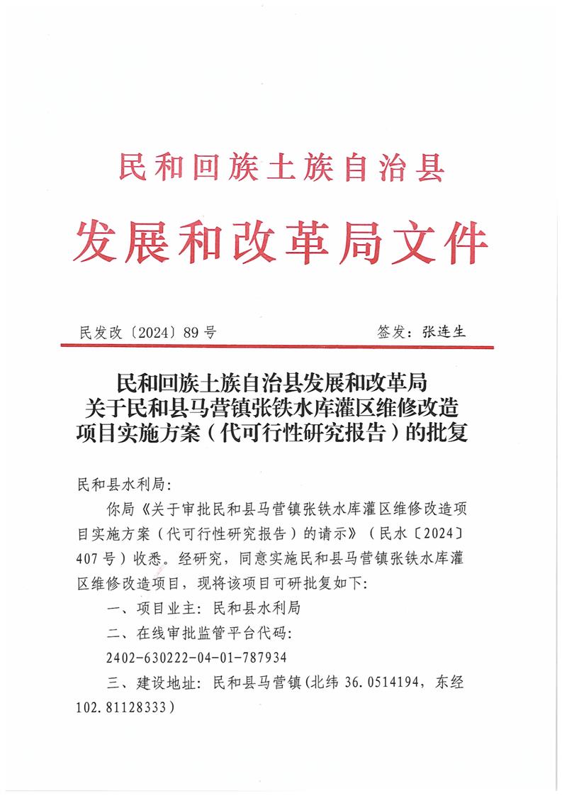 关于民和县马营镇张铁水库灌区维修改造项目实施方案(代可行性研究报告)的批复