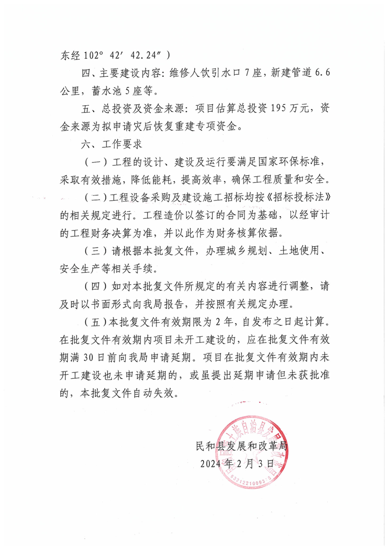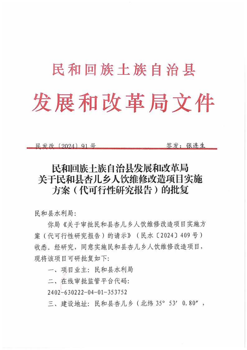 关于民和县杏儿乡人饮维修改造项目实施方案(代可行性研究报告)的批复