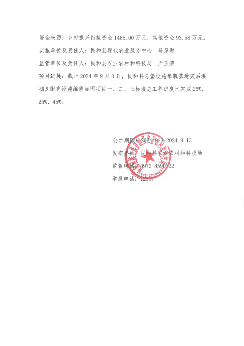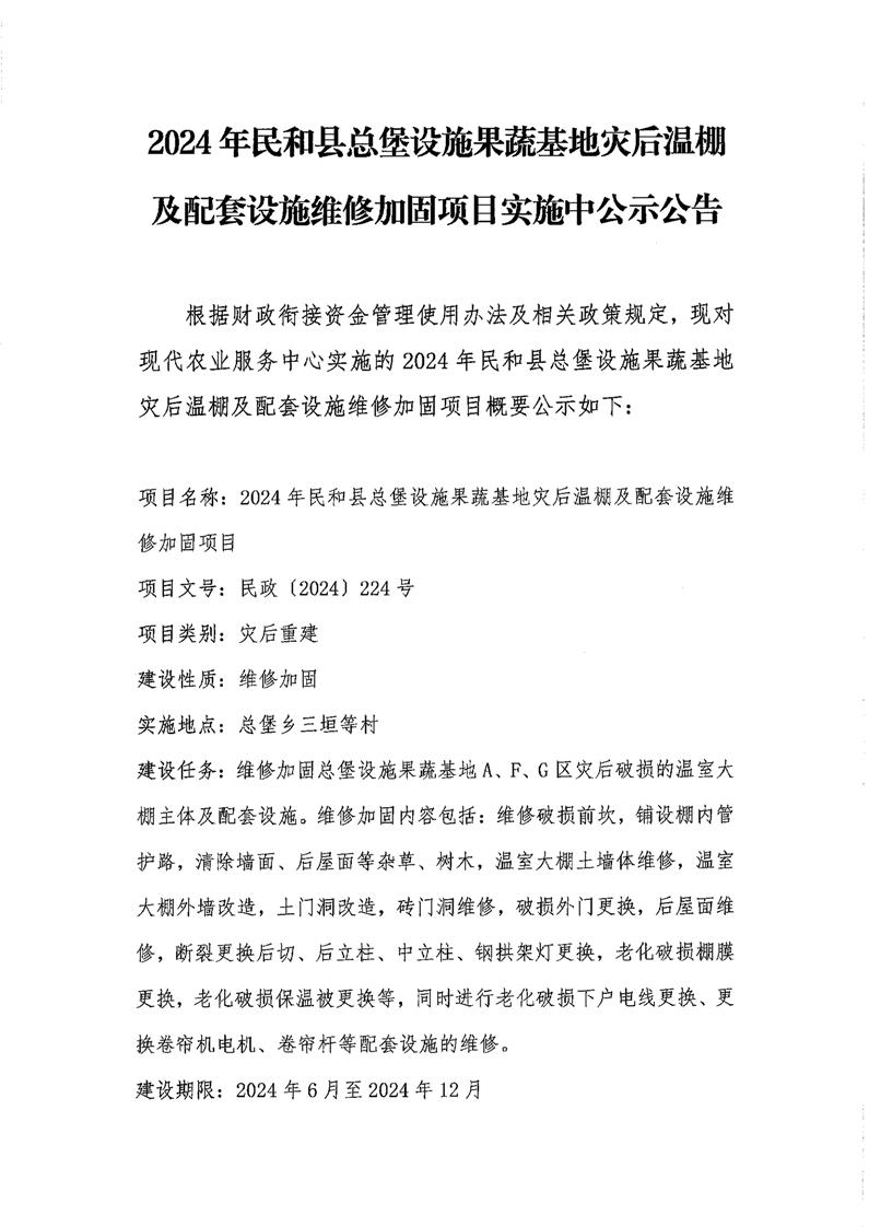 2024年民和县总堡设施果蔬基地灾后温棚及配套设施维修加固项目实施中公示公告
