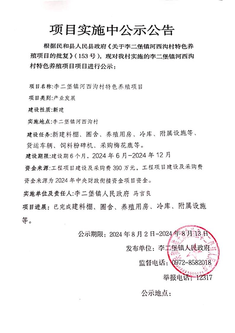 李二堡镇河西沟村特色养殖项目实施中公示公告