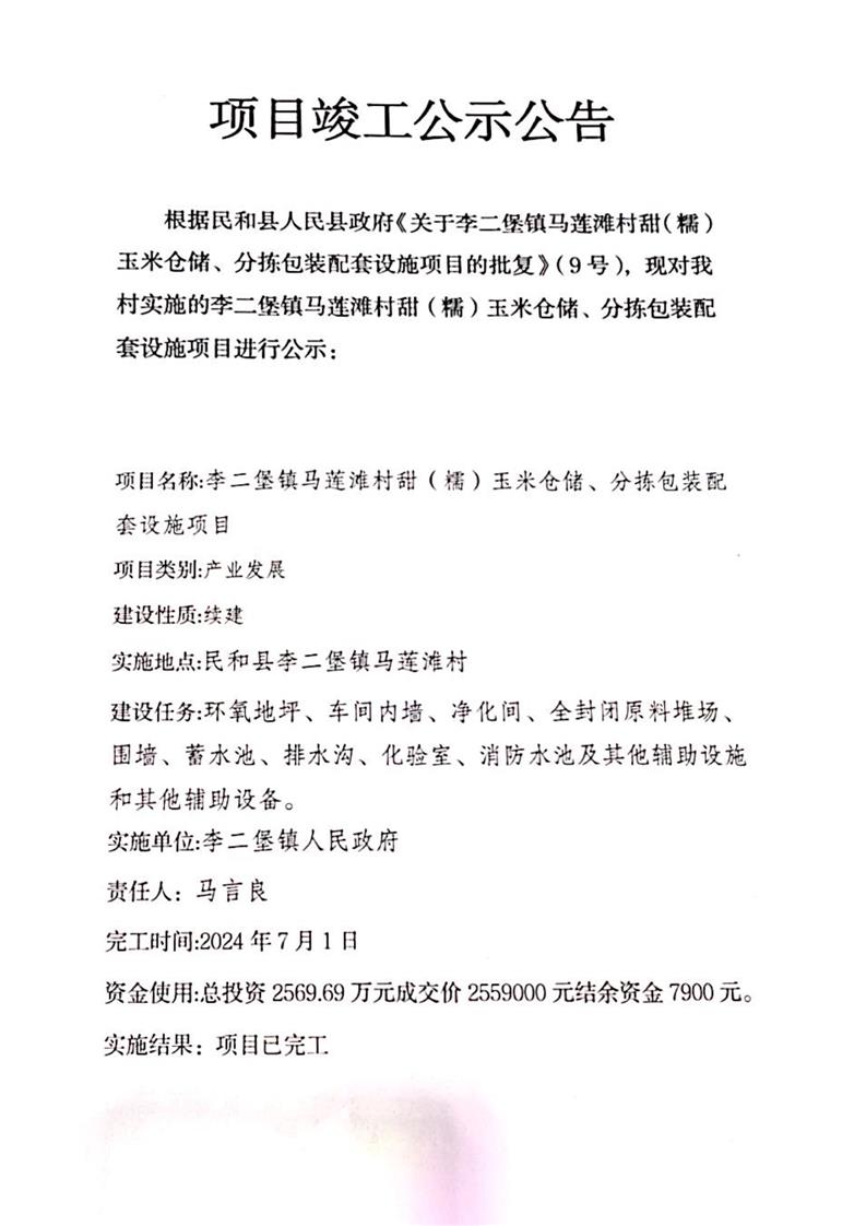 李二堡镇马莲滩村甜(糯)玉米仓储、分拣包装配套设施项目竣工公示公告