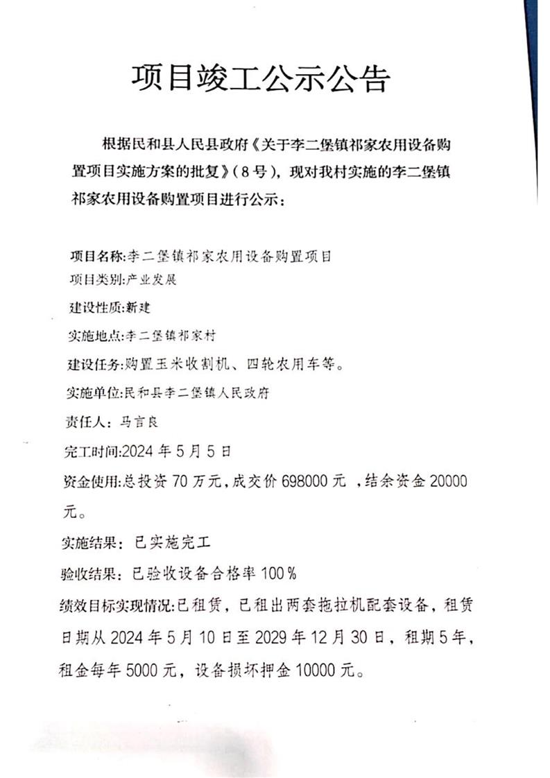 李二堡镇祁家农用设备购置项目竣工公示公告