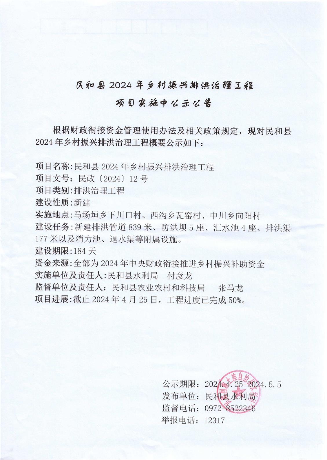 民和县2024年乡村振兴排洪治理工程项目实施中公示公告