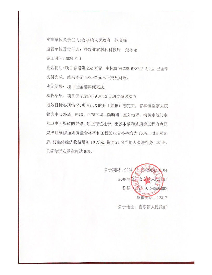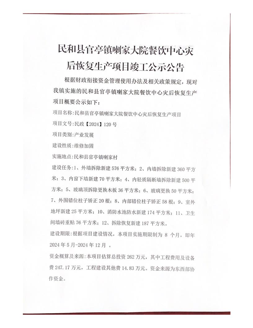 民和县官亭镇喇家大院餐饮中心灾后恢复生产项目竣工公示公告
