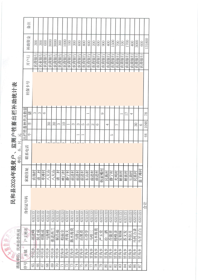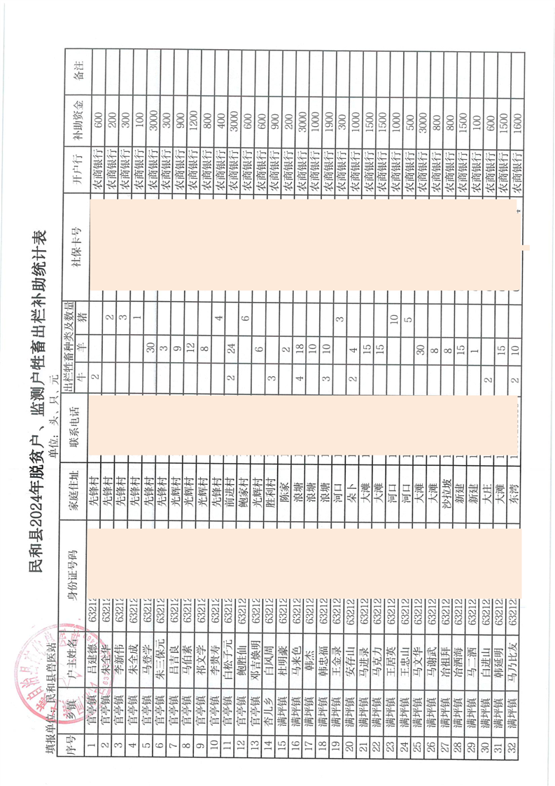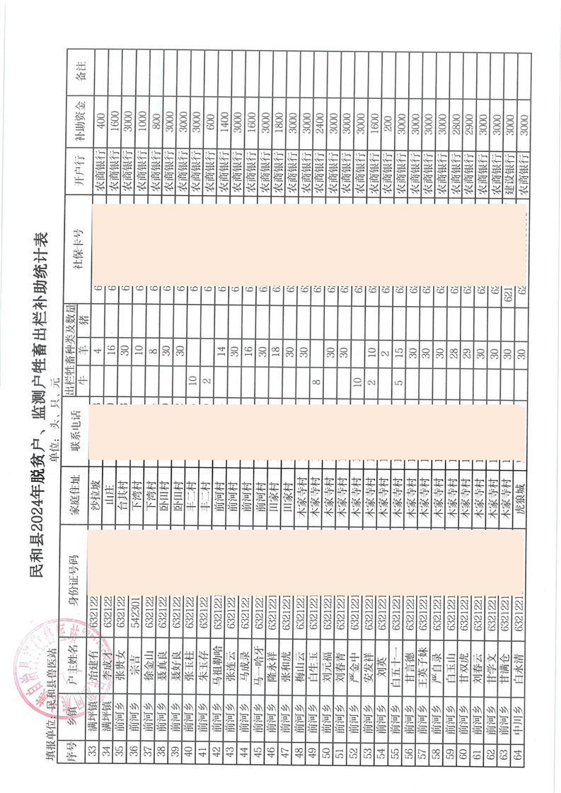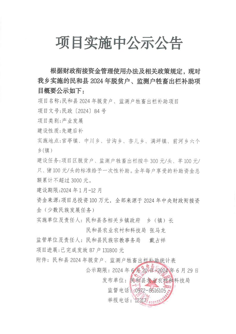 民和县2024年脱贫户、监测户牲畜出栏补助项目实施中公示公告