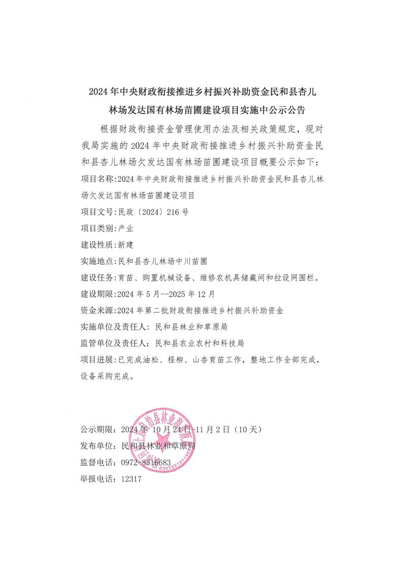 2024年中央财政衔接推进乡村振兴补助资金民和县杏儿林场欠发达国有林场苗圃建设项目实施中公示公告