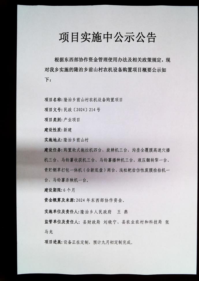 隆治乡前山村农机设备购置项目实施中公示