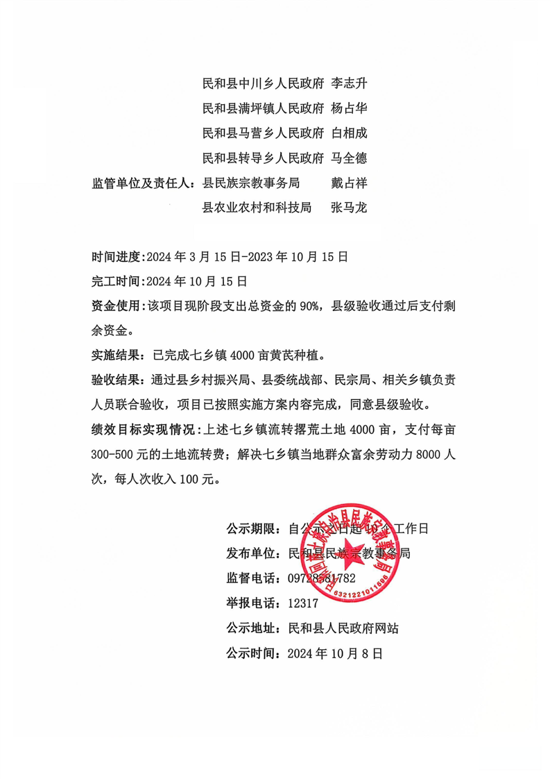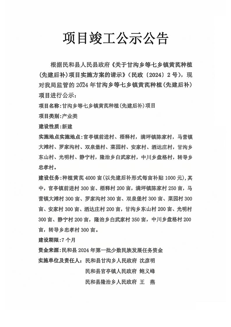 甘沟乡等七乡镇黄芪种植项目(先建后补项目)竣工公示公告
