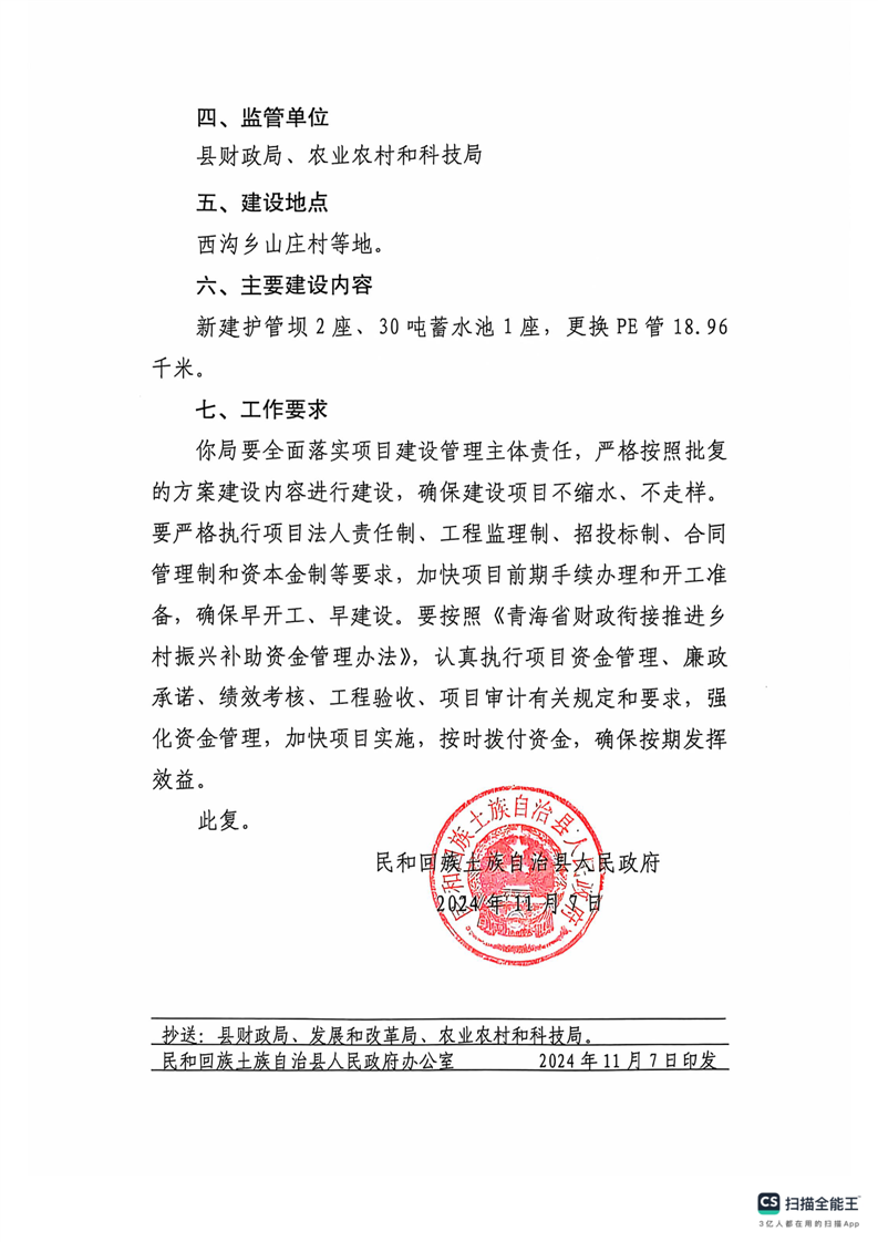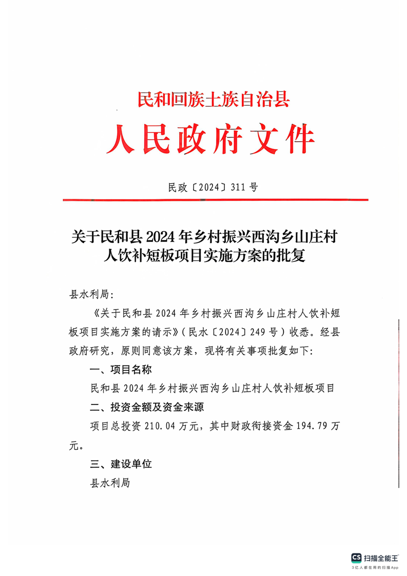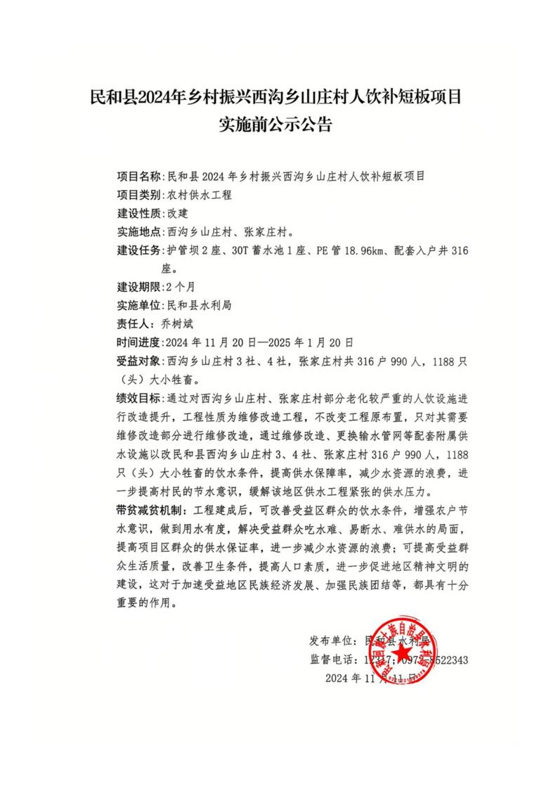 民和县2024年乡村振兴西沟乡山庄村人饮补短板项目实施前公告