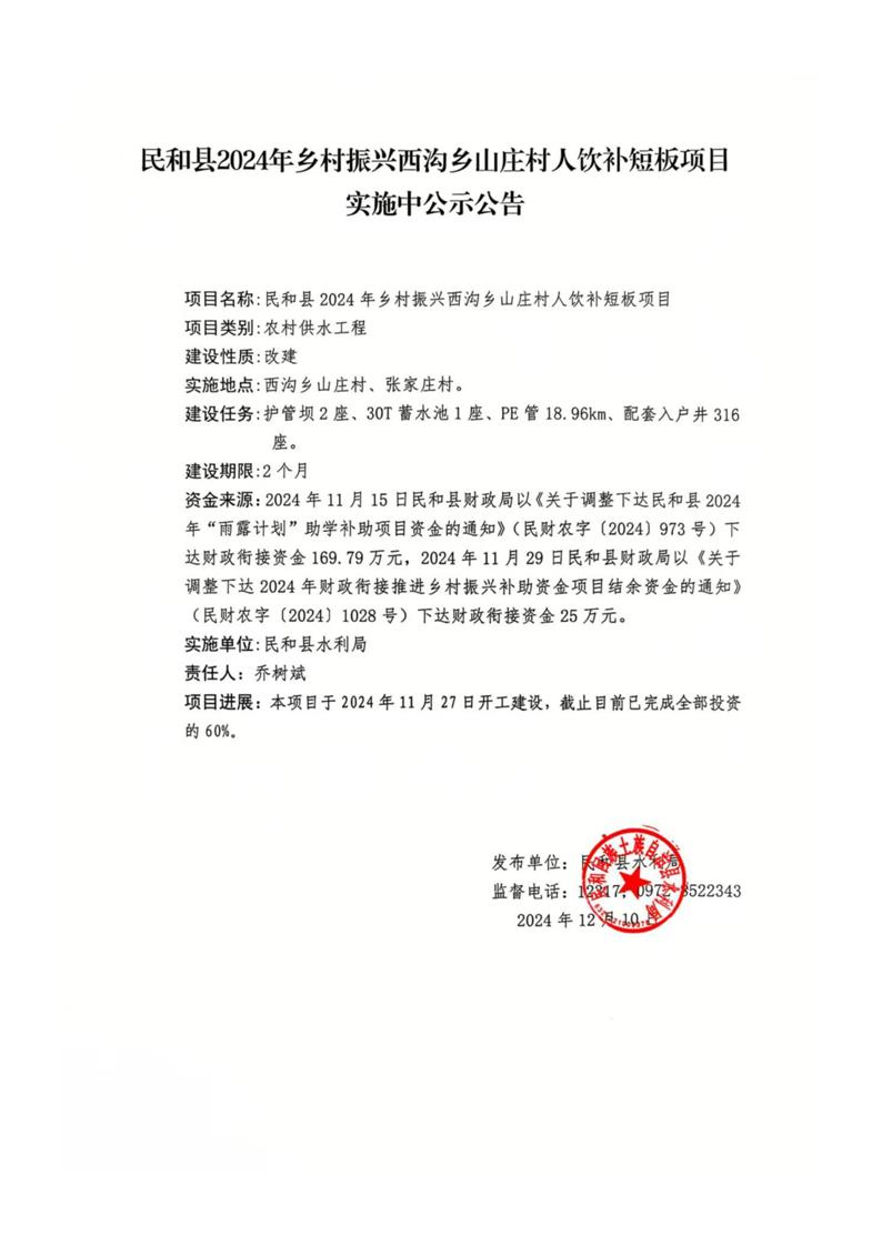 民和县2024年乡村振兴西沟乡山庄村人饮补短板项目实施中公告