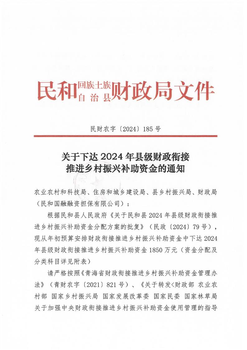 民财农字【2024】185号 关于下达2024年县级财政衔接推进乡村振兴补助资金的通知
