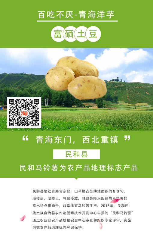 青海民和县地处西北高原,特有的沙质土壤,纯净无污染的生态环境,丰富的光照,完全靠天降雨生长,使本地土豆原生态无污染,个大口感佳,具备了较高的营养价值和人体有益的物质。可以用来主治胃痛、痄肋、痈肿、湿疹、烫伤,是和胃健中药和解毒消肿药,并且对调解消化不良有特效,富有营养,是抗衰老的食物之一。