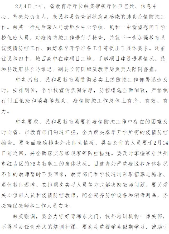 省教育厅厅长韩英督查民和县教育系统疫情防控工作