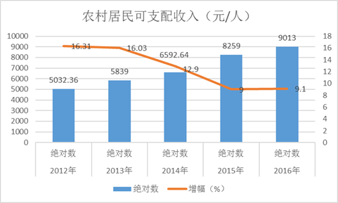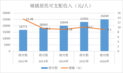 2016年,新口径计算的全体居民人均可支配收入达到 13771元,同比增长9.3%。其中:城镇居民人均可支配收入25049元,同比增长9.1%,农村常住居民人均可支配收入9013元,同比增长9.1%。