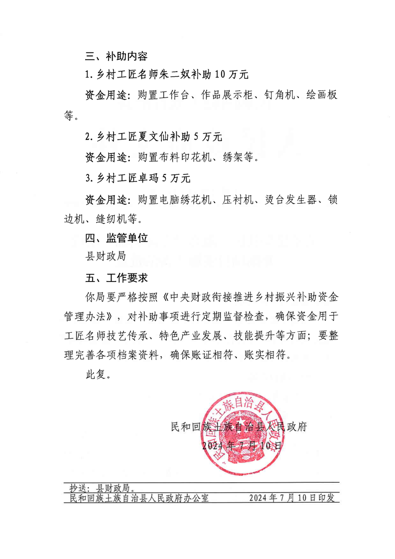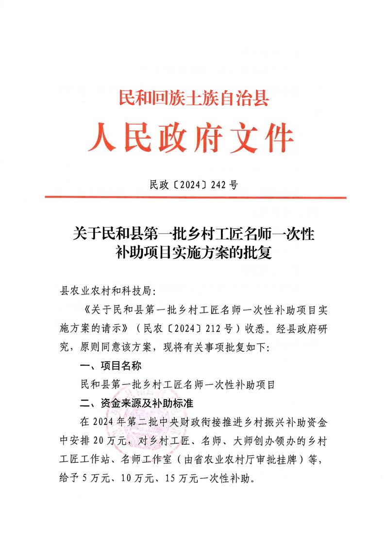 关于民和县第一批乡村工匠名师一次性补助项目实施方案的批复