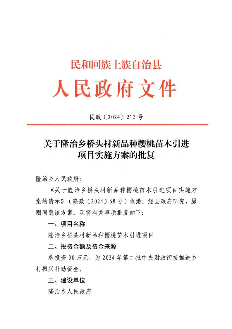 关于隆治乡桥头村新品种樱桃苗木引进项目实施方案的批复