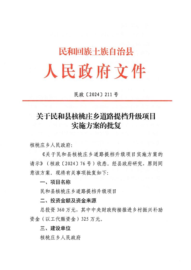 关于民和县核桃庄乡道路提档升级项目实施方案的批复