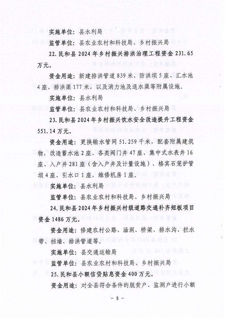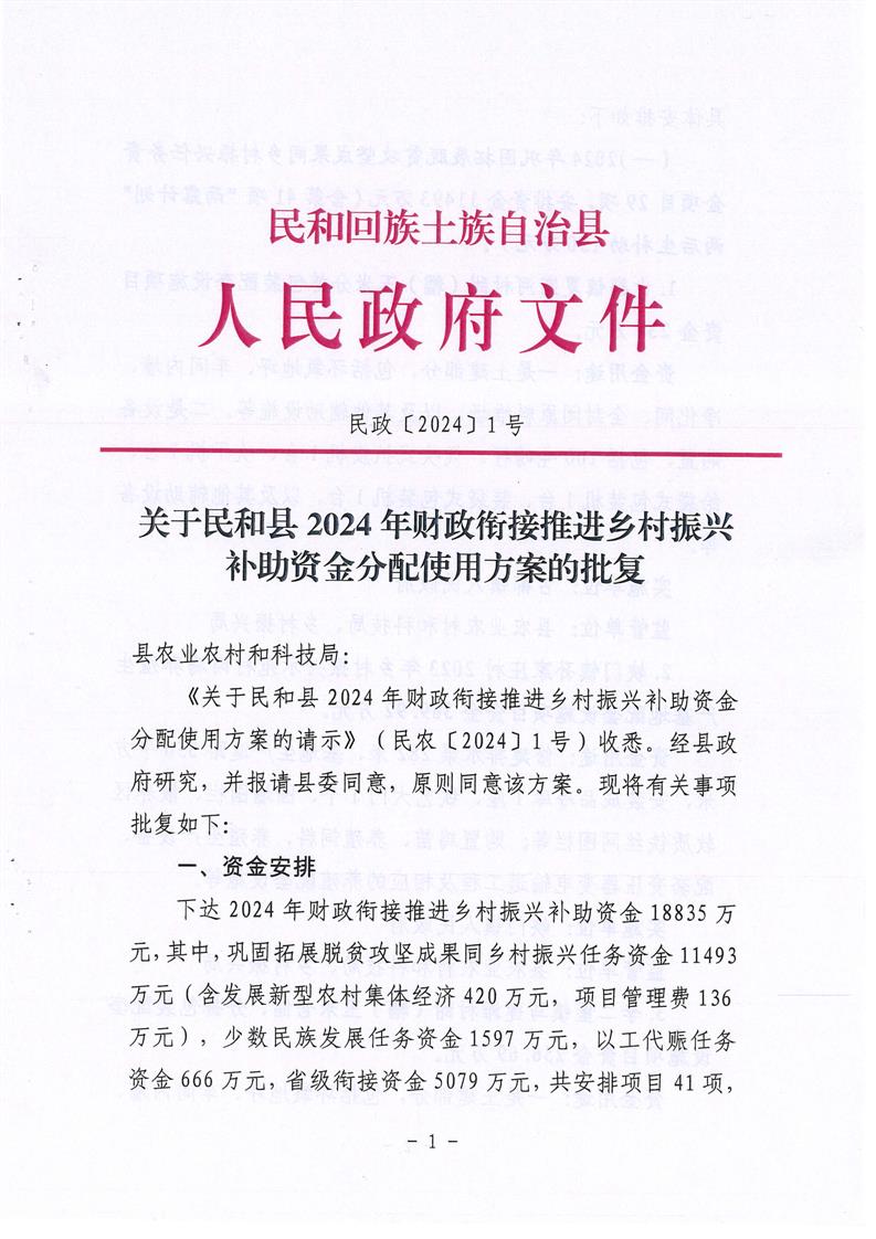 民和县2024年财政衔接推进乡村振兴补助资金分配使用方案的批复