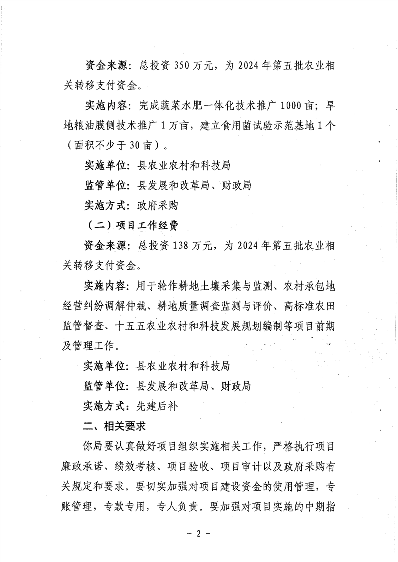 关于2024年第五批农业相关转移支付资金使用工作方案的批复