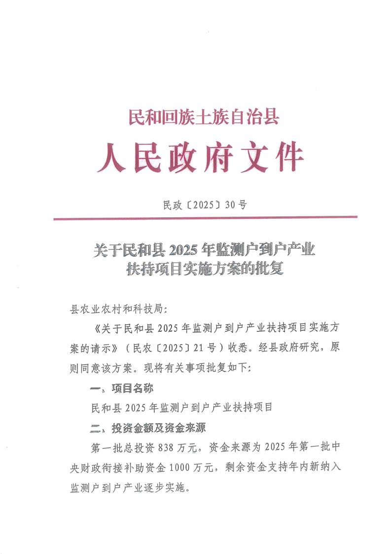 关于民和县 2025 年监测户到户产业扶持项目实施方案的批复