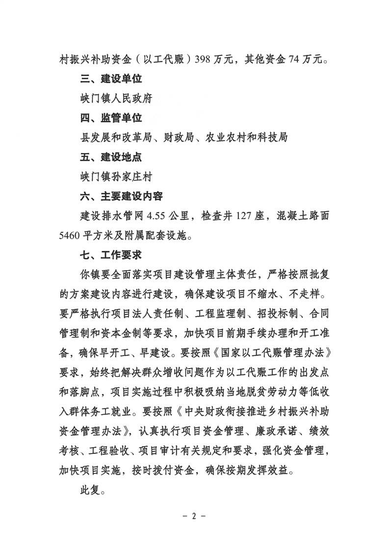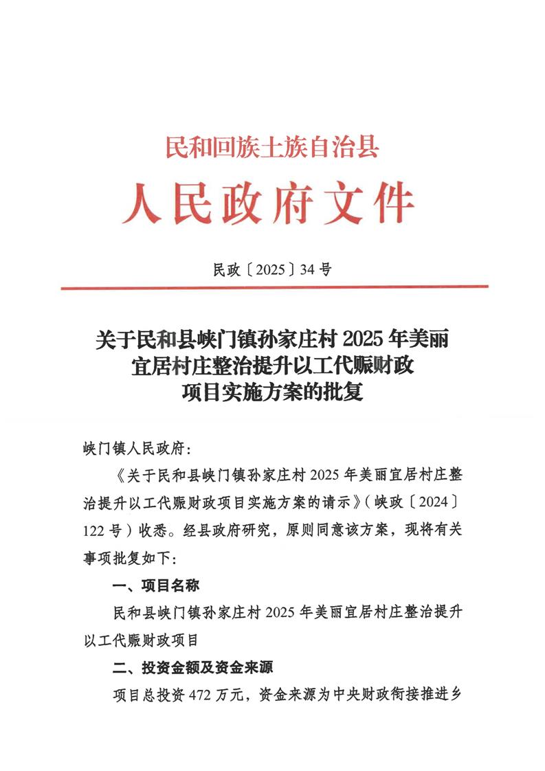 关于民和县峡门镇孙家庄村2025年美丽宜居村庄整治提升以工代赈财政项目实施方案的批复
