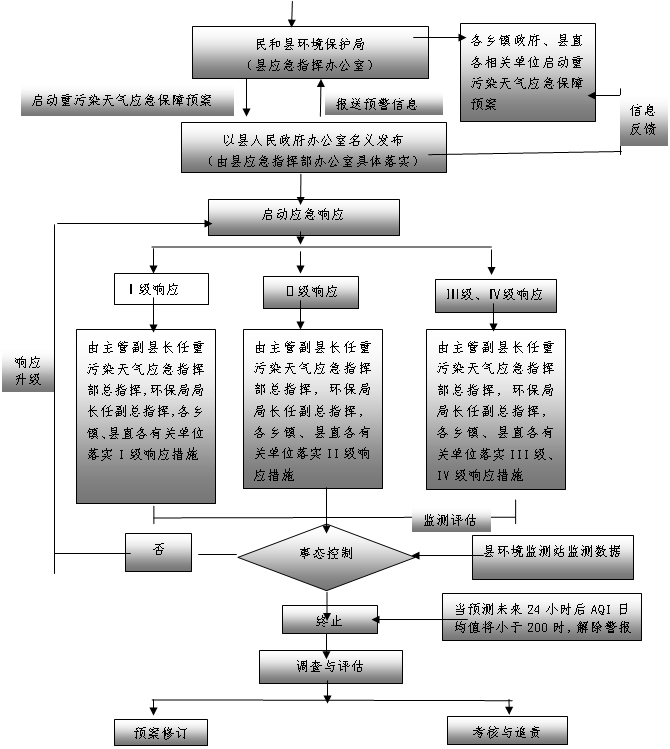 县环境保护局与气象局建立联席会商制度,对环境空气质量和气象及时进行监测、预测,联合会商。环境保护局负责开展我县辖区内环境空气质量监测预警工作。气象局负责开展辖区内气象状况监测预警工作。在出现静风、逆温、雾霾、沙尘等不利气象状况、且不利气象条件预计持续24小时以上,AQI日均值有可能超过200时县环境保护局、气象局立即启动会商机制,开展联合预测分析,判定是否会出现重污染条件,一旦确定,立即制作预警信息,报告县应急指挥部办公室进入预警程序,县应急指挥部办公室组织专家分析研判后,向县应急指挥部报告并提出预警发布和应急响应启动建议。