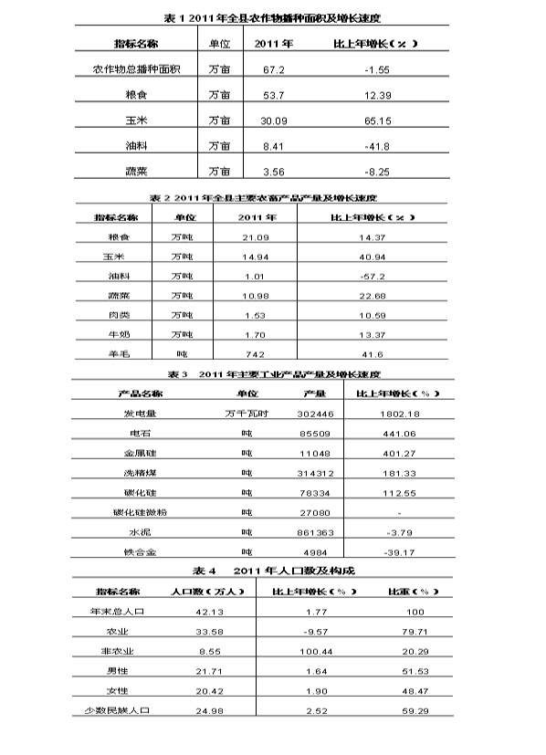 2011年,全县各族人民在县委、县政府的正确领导下,坚持以科学发展观为统领,以加快转变经济发展方式为主线,以改善民生为根本,在各项工作任务十分繁重的形势下,凝心聚力,自我加压,扎实工作,超额完成了既定的各项目标任务,主要指标均创历史新高,增速位列全区、全省前列,取得了县域经济较快发展、社会事业全面进步、人民生活不断改善、社会大局安定和谐的新成绩,实现了“十二五”时期良好开局。