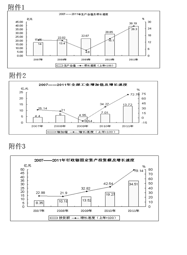行政辖固定资产投资完成34.51亿元,增长79.14%。分产业看:第一产业完成投资9.34亿元,增长46.67%;第二产业完成投资15.67亿元,增长102.22%,其中工业固定资产投资完成15.02亿元,增长93.89%;第三产业完成投资9.50亿元,增长84.57%。(附件3)