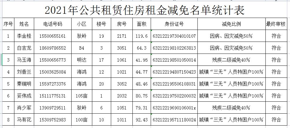 2021年公共租赁住房租金减免名单统计表