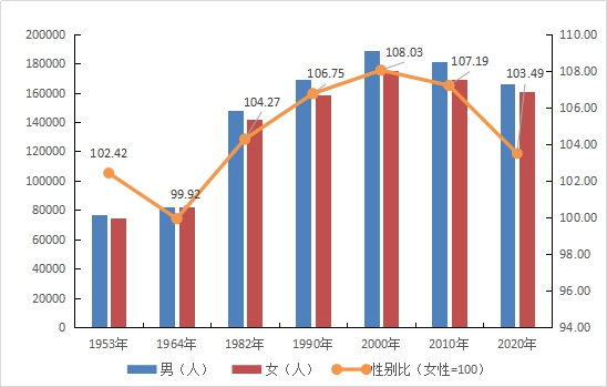 全县人口〔2〕中,男性人口为166284人,占50.86%;女性人口为160680人,占49.14%。总人口性别比(以女性为100,男性对女性的比例)为103.49,比2010年第六次全国人口普查下降3.7。