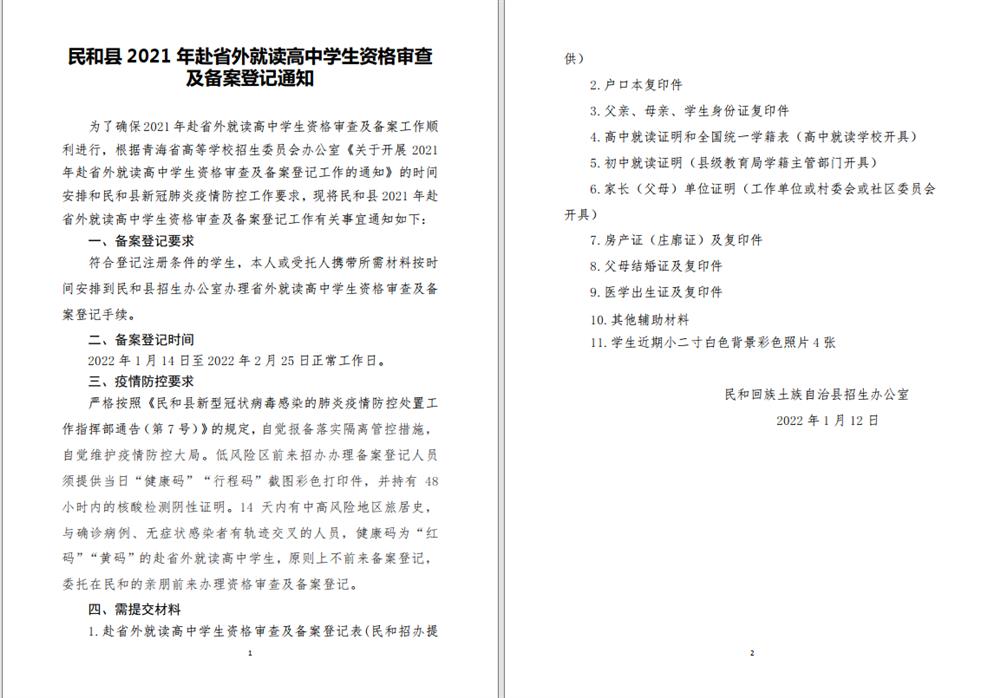 民和县2021年赴省外就读高中学生资格审查及备案登记通知
