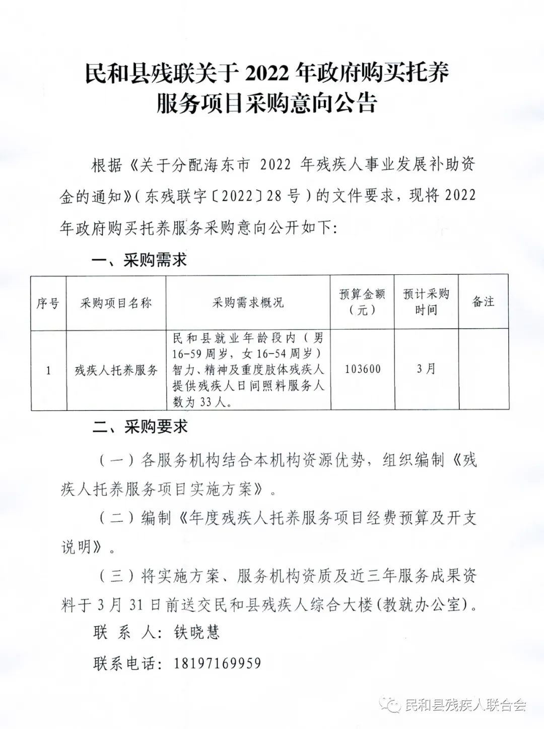 民和县残联关于2022年政府购买托养服务项目采购意向公告