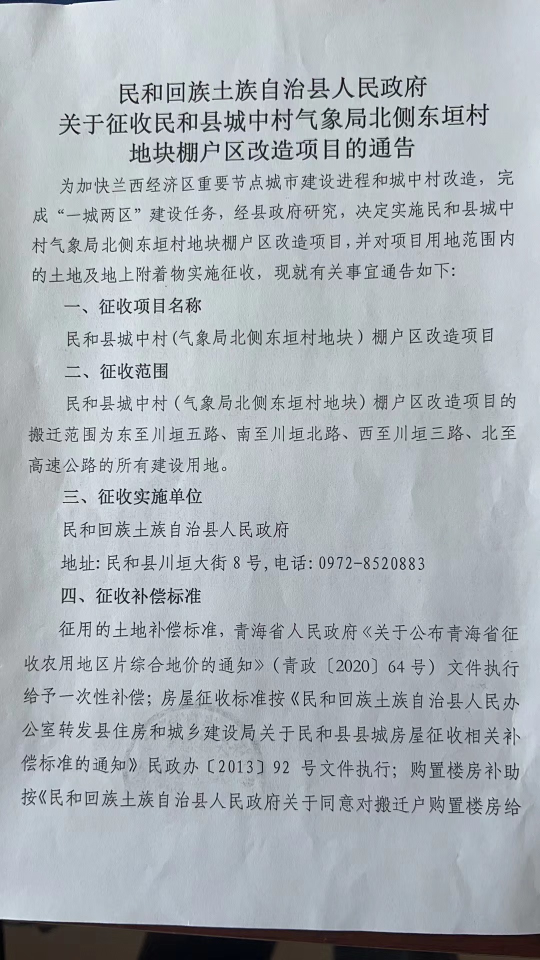 关于征收民和县城中村气象局北侧东垣村地块棚户区改造项目的通告