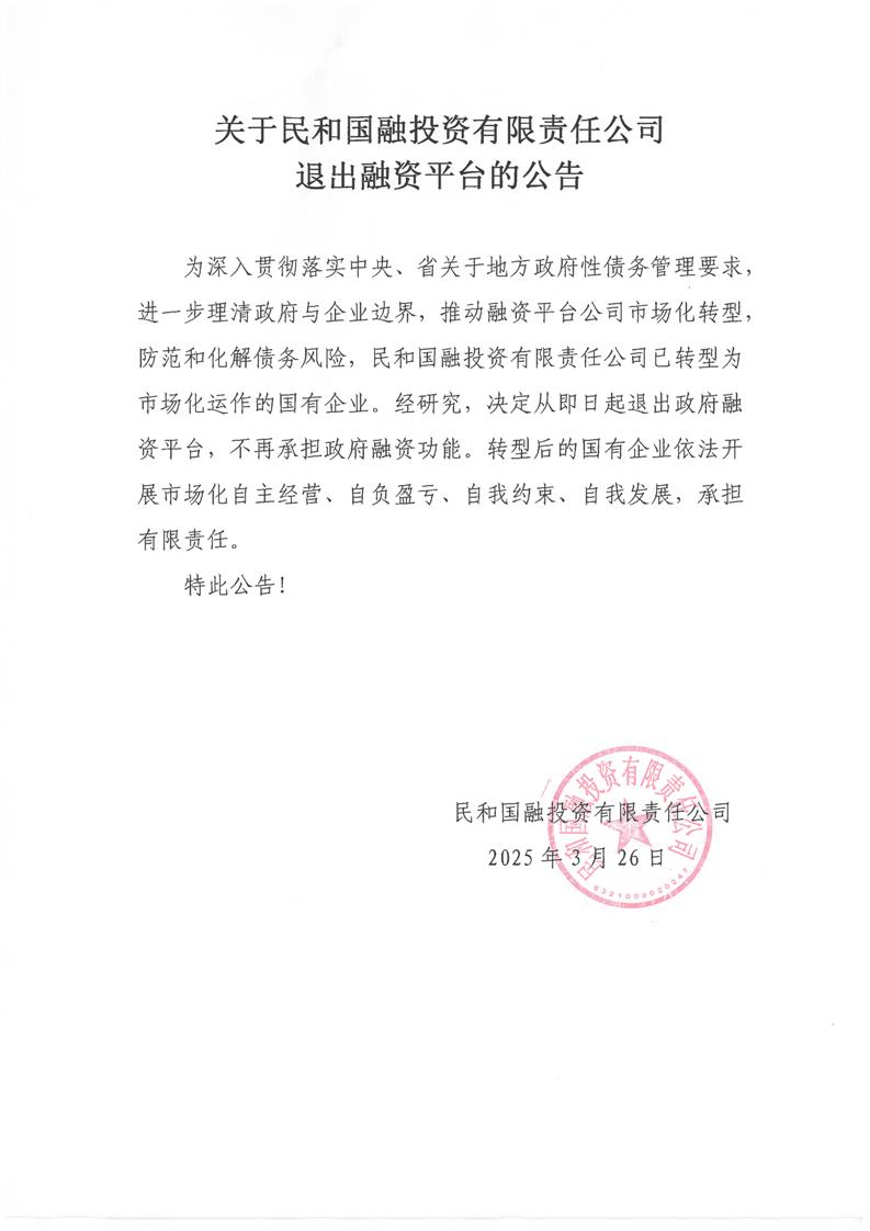 关于民和国融投资有限责任公司退出融资平台的公告