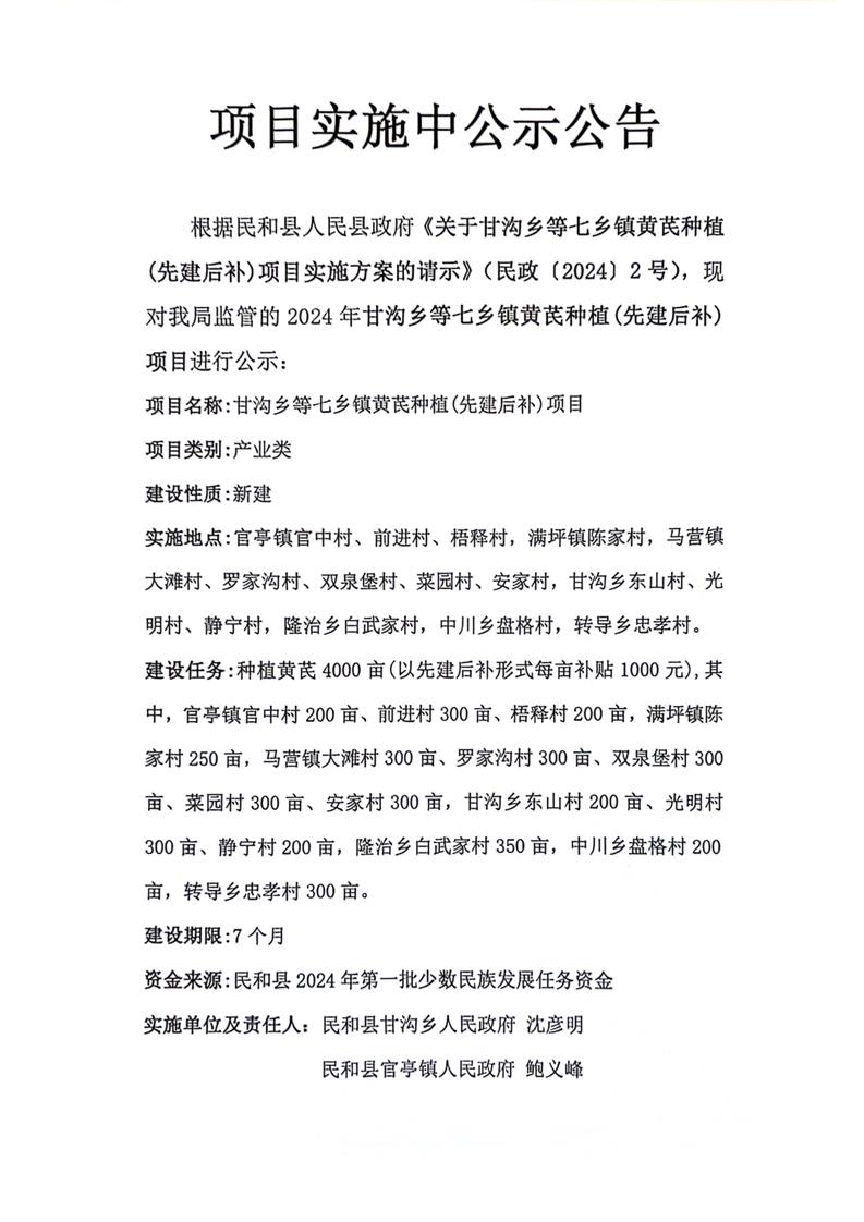 甘沟乡等七乡镇黄芪种植(先建后补)项目实施中公示公告