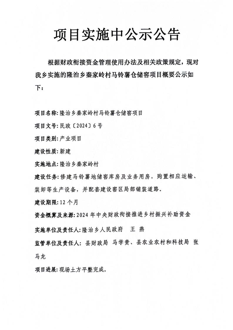 隆治乡秦家岭村马铃薯仓储窖项目县级实施中公示公告
